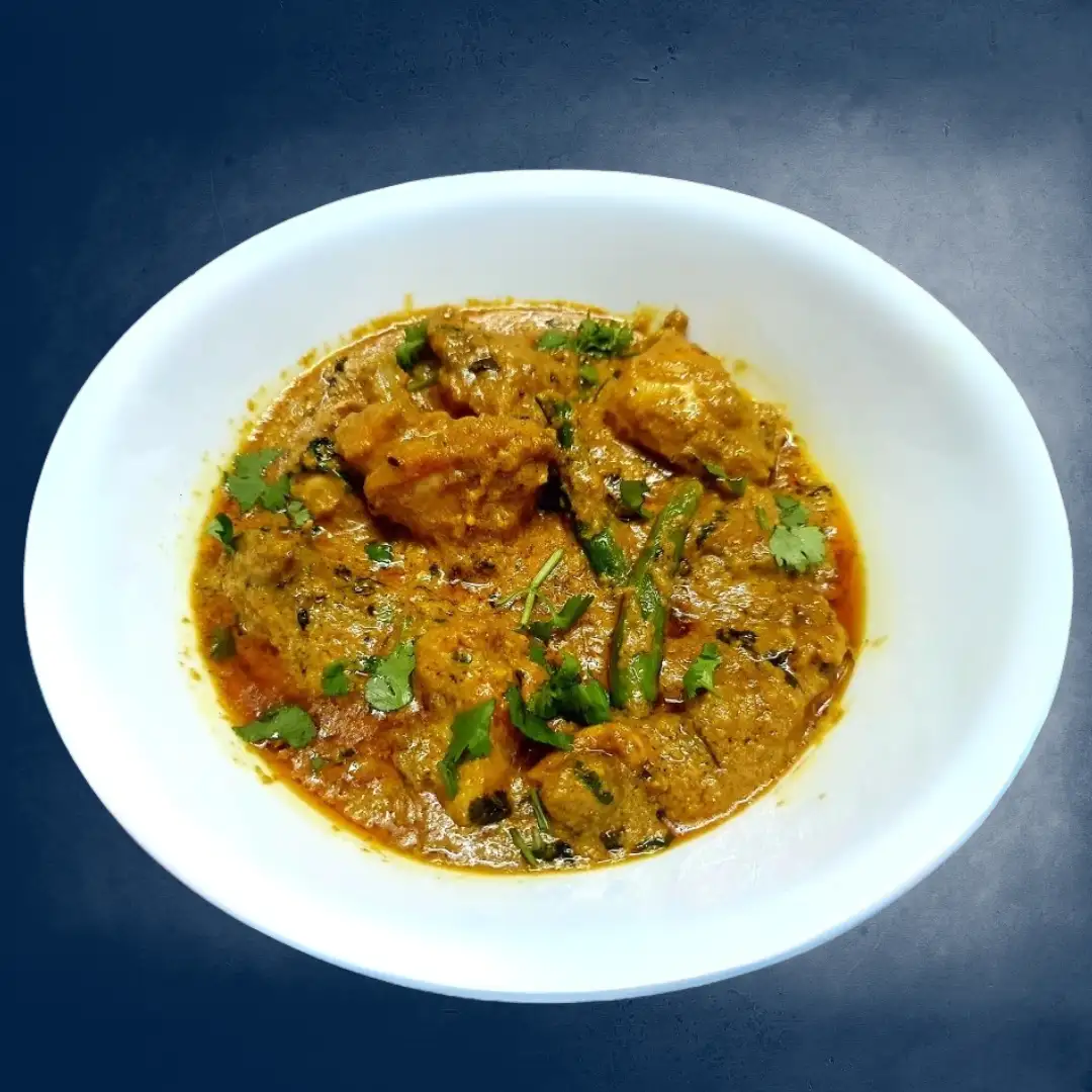 tender chicken pieces slow-cooked in a rich, aromatic tomato and cashew-based curry with a blend of traditional spices, prepared in a handi pot for an authentic, flavorful experience, perfect with naan or rice