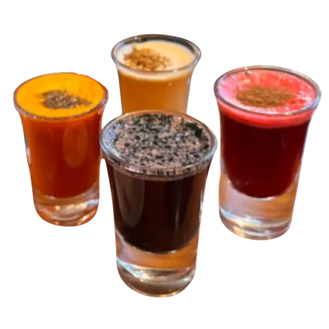 Small granola bowl, hummus, poached egg on sourdough toast, with health shot, muffin or energy ball